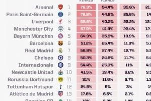 Opta欧冠夺冠概率(前10位):